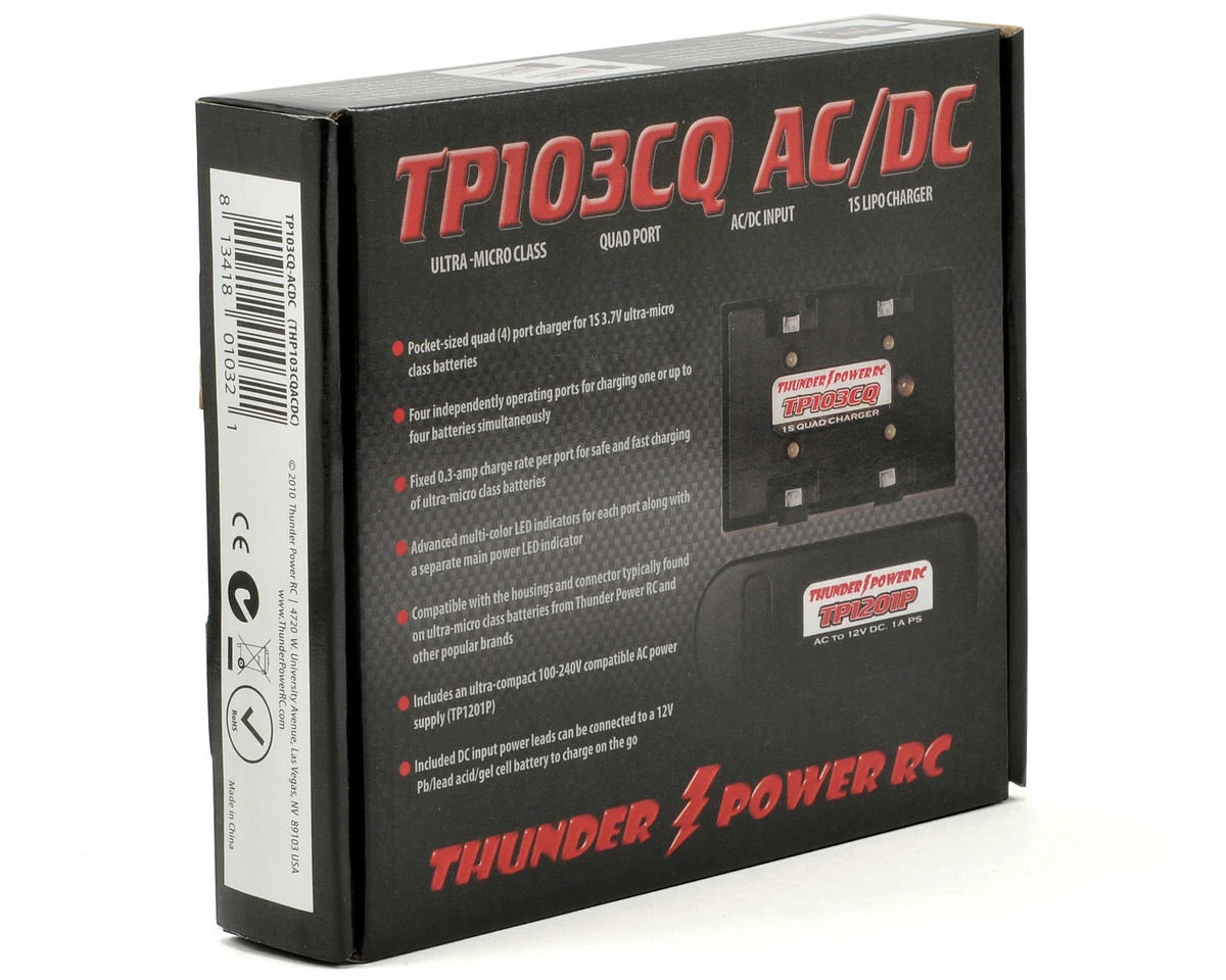 This is the Thunder Power TP103CQ-ACDC 1S LiPo Quad/4-Port 12V AC/DC Charger. The Thunder Power RC TP103CQ-ACDC combo is the ideal, pocket-sized charger and power supply setup to charge the 1S 3.7V LiPo batteries typically used to power ultra-micro and similar class airplanes, helicopters and other models. The TP103CQ quad (4) port charger can be easily and conveniently powered from a 100-240V outlet using the included TP1201P AC to DC, 1-amp power supply, while the included DC input power leads can be connected to a typical 12V Pb/lead acid/gel cell battery for charging on the go. The charger features four ports that operate independently and allow you to charge up to four batteries simultaneously at a rate of 0.3A per port.
