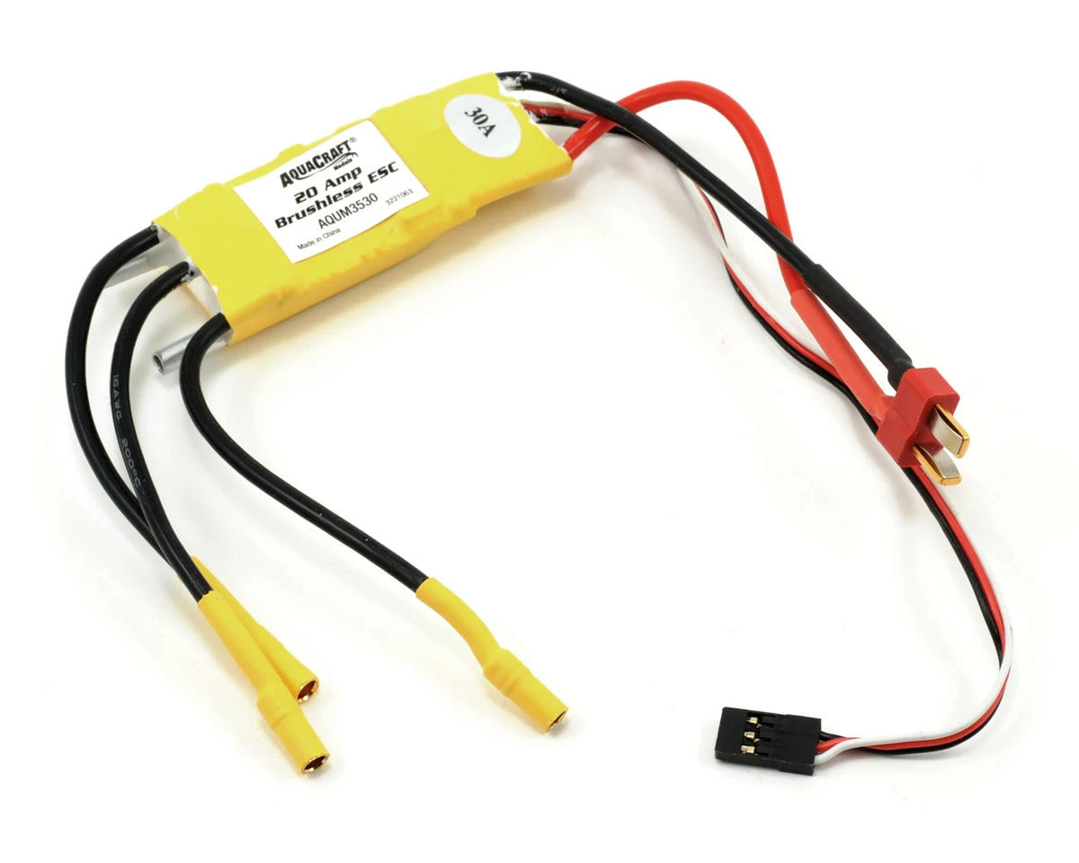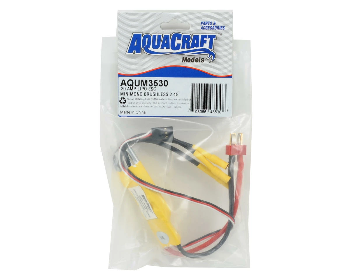 This is a replacement AquaCraft 20-Amp Brushless ESC, and is intended for use with the AquaCraft Minimono boat. This 20 Amp ESC was designed for 3S LiPo applications and includes a factory installed Deans battery connector, as well as factory installed 3.5mm bullet connectors for the motor.