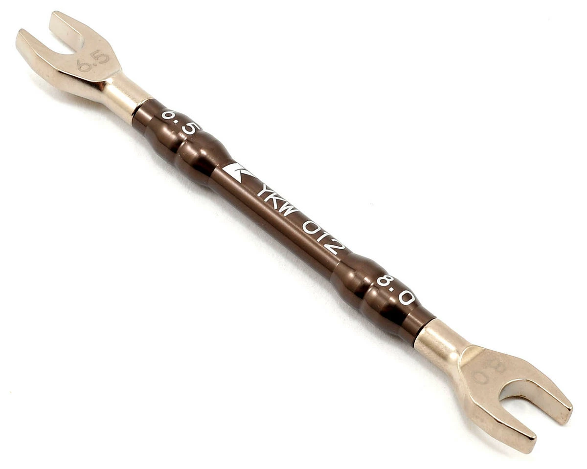 This is a Kyosho Kanai Tools Spanner Wrench, with 6.5mm and 8.0mm ends. This wrench was developed by Yuichi Kanai specifically for use with the Inferno MP9 series vehicles. The deep 8mm end allows easy installation/removal of the shock standoffs on the shock towers, while the 6.5mm end is perfect for easy ball end installation on the turnbuckles and rods.