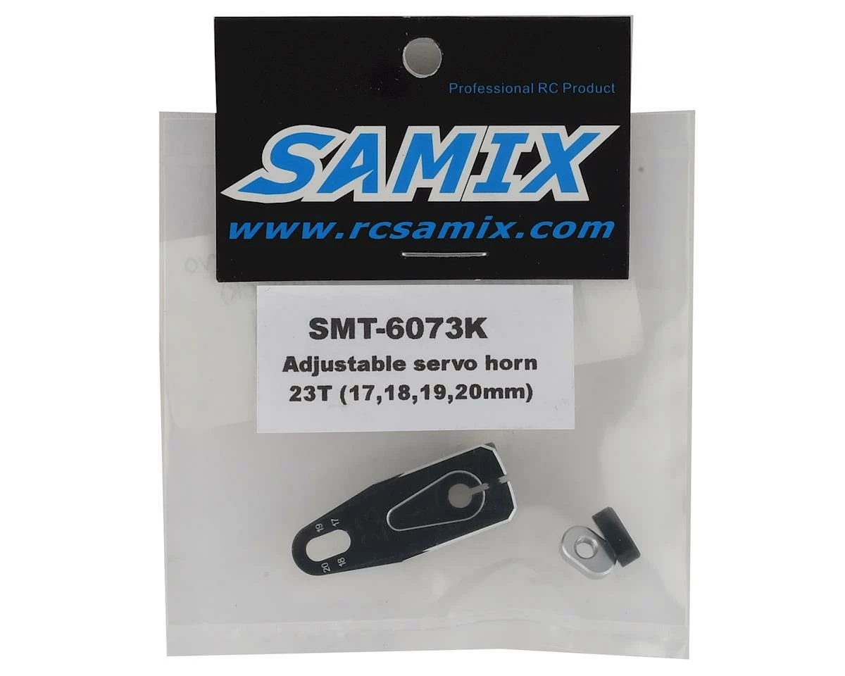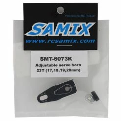 The Samix Aluminum Adjustable Servo Horn allows you to adjust the servo link mounting point on the servo horn in four increments – 17, 18, 19, and 20mm. This adjustment allows you to alter the feel and power of the steering. When mounted closer to the spline, it will create more mechanical torque. When mounted further from the spline, it will increase the speed and increase mechanical throw of the steering rack.ย