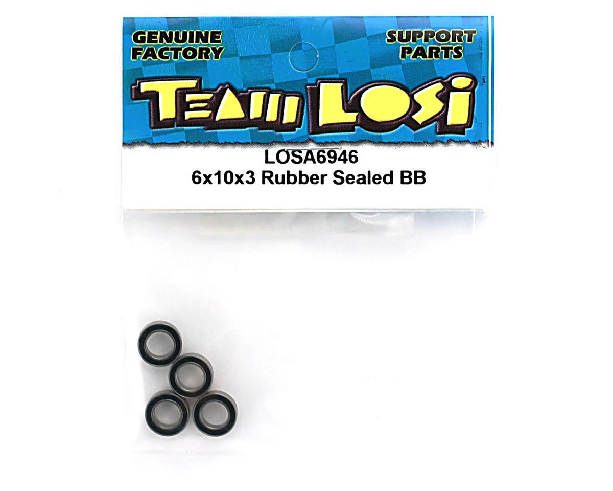 This is a pack of four 6x10x3 rubber sealed ball bearings for the Losi 8IGHT racing buggy. These bearings are used in the steering linkage/servo saver assembly.