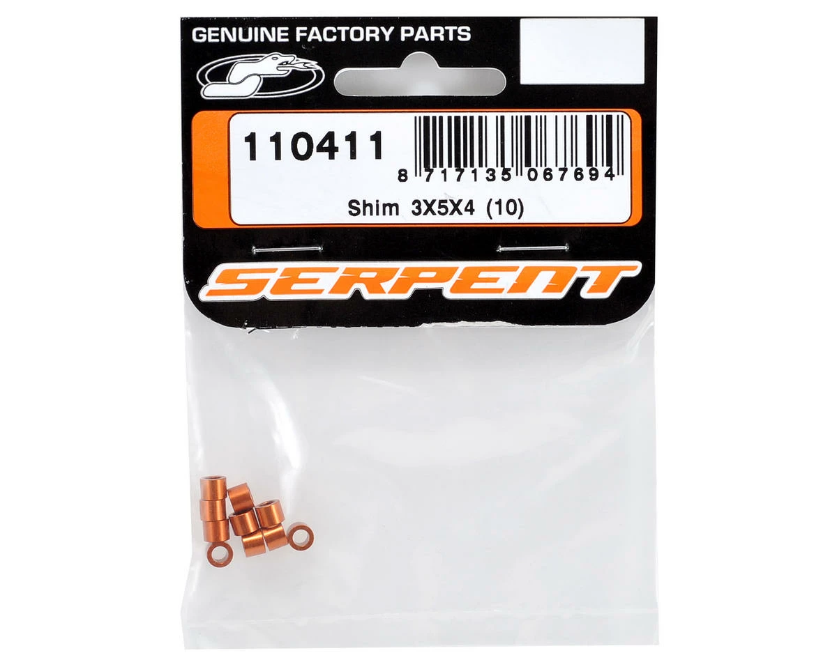 This is a pack of ten replacement Serpent 3x5x4mm Aluminum Shims, and are intended for use with the Serpent S811 Cobra GT 1/8 on road car.