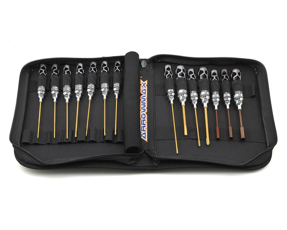 The Arrowmax Honeycomb V2 Tool Set features an eye-catching hollow honeycomb handle design, spring steel titanium nitride tips and a lexan bottom cover that provides a more comfortable, controllable and lighter feeling. This complete tool set includes hex, and ball end wrenches, as well as flat and Phillips screwdrivers, and nut drivers. All critical tools that every enthusiast needs in their tool bag regardless of what brand car you run.