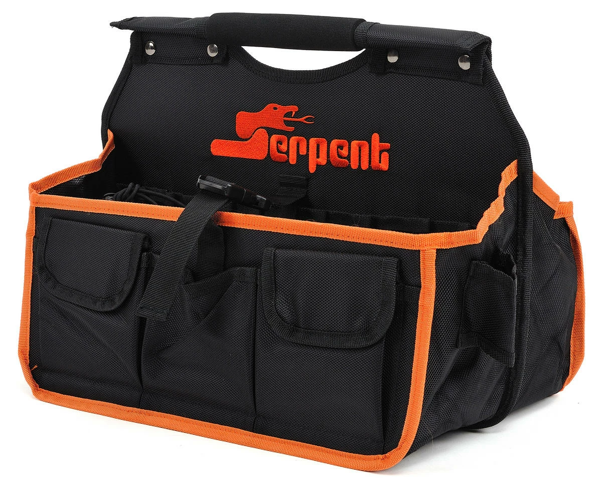 This is the Serpent Pit Caddy. This caddy provides lots of space for your pit-lane utilities, tools, fuel, starter box, fuel bottle and gun, along with anything else you need to bring to the pit lane. A strong foam padded carrying handle, strong nylon material, and hard nylon inner plates for stability help to make the bag durable, while strong belts to hold it in shape when the bag is full. When empty, the bag folds together with ease, so the bag is easy to transport.
