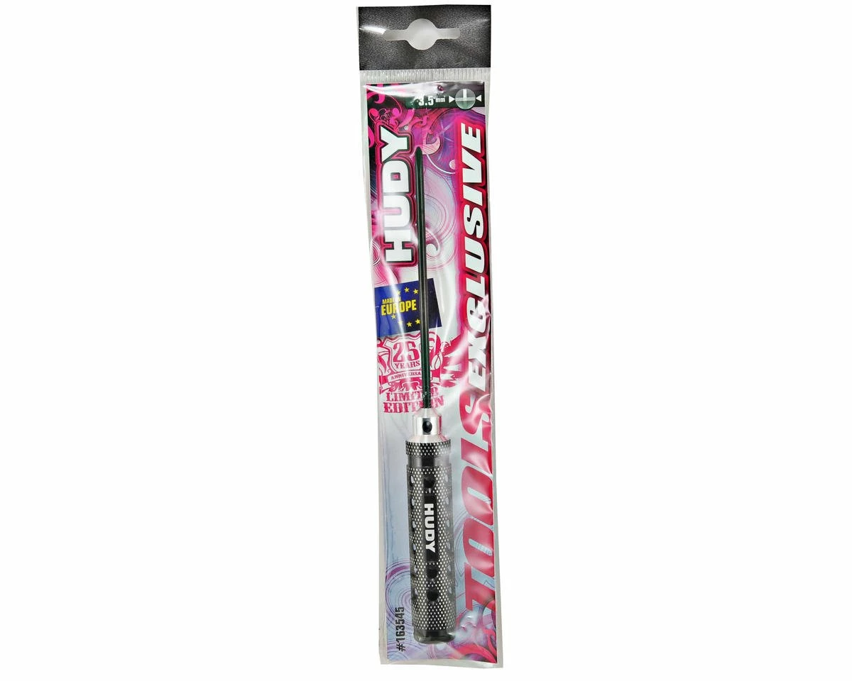 This is the Hudy Limited Edition 3.5mm Phillips Screwdriver. Featuring a super-lightweight CNC-machined Swiss 7075 T6 aluminum handle with a diamond pattern surface for unsurpassed grip. The handle includes a black plastic cap press fit into the handle end. Optional color-coded plastic caps (violet, red, blue) are available to customize the tools to your specifications.