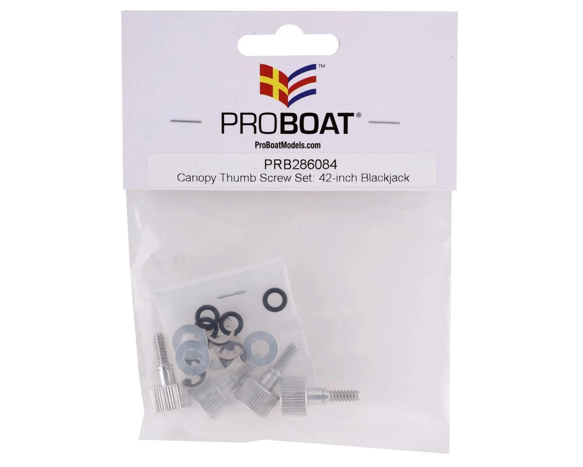 Pro Boatย Blackjack 42 Canopy Thumb Screw Set. This replacement thumb screw set is intended for the Pro Boat Blackjack 42. Package includes four thumb screws, four washers, four O-rings and four clips.