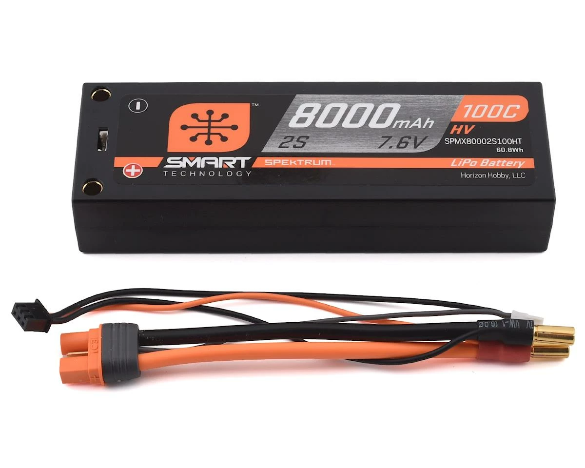 This is the Spektrum 2S 100C Smart LiPo Shorty Pack Battery with 5mm Tubes. Spektrum Smart technology LiPo Batteries practically take care of themselves. When combined with a Spektrum Smart Battery Charger, the unique parameters, history of the battery and more are all available the instant it’s connected. Charging a Smart Battery is easy as it gets, plus Smart LiPo battery packs are programmable to meet your exact charging needs. But the crowning feature of a Spektrum Smart LiPo battery is that it can be programmed to safely self-discharge to storage condition!