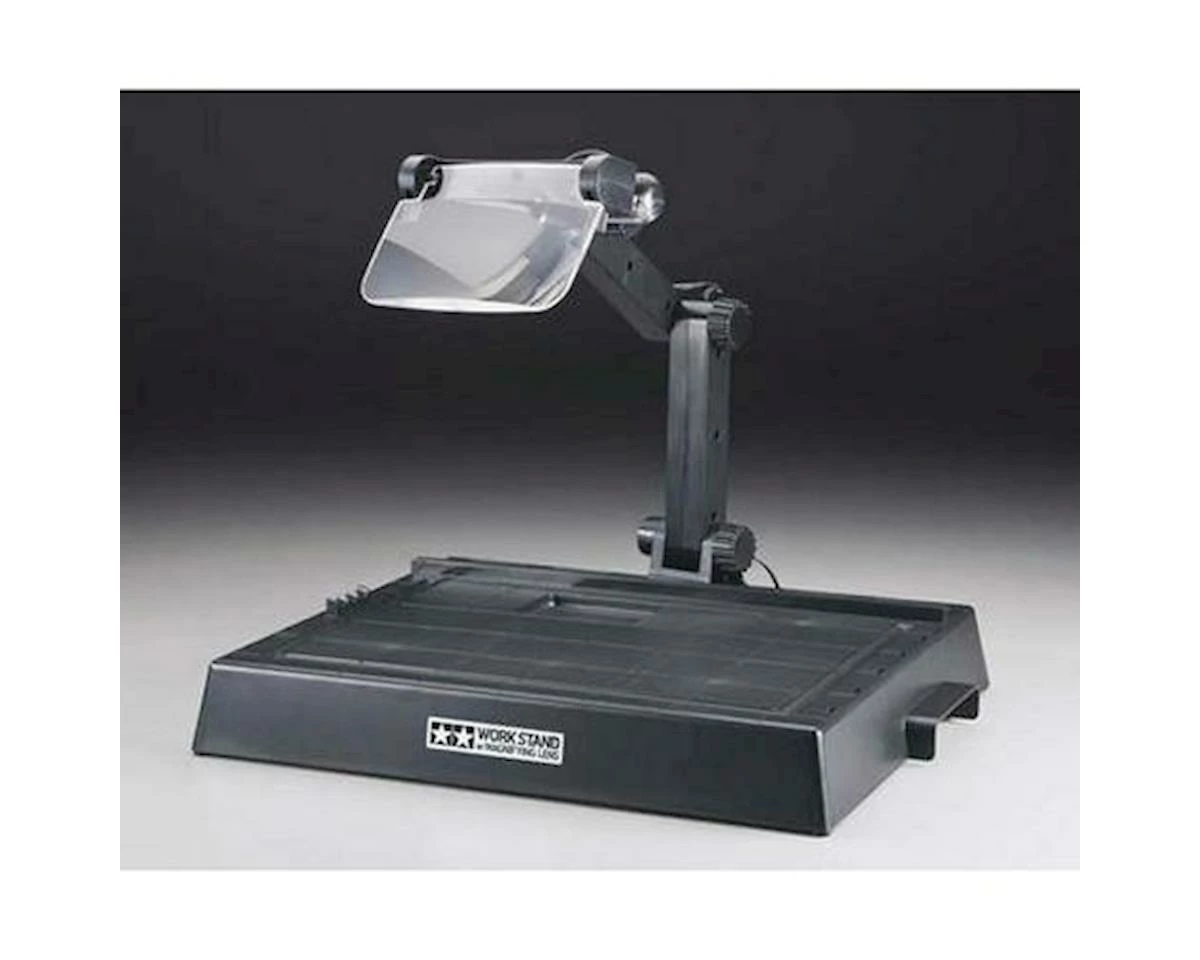 The Tamiya Modeling Work Station Do you have to strain your eyes when you are working on that fine detailing? Do you always have a messy work area and need more space to work with? Do you want a compact workbench that can be easily carried anywhere you go? If you answered yes to any of these questions, Tamiya has the perfect product for you, the Tamiya Work Stand W/Magnifying Lens! Featuring a large acrylic magnifying lens with 2X magnification, you will be seeing all that small detailing so much clearer, making it easy to work long hours on your favorite model. To make sure you always have perfect lighting in the place where you need it most, 6 white LED lamps are installed just behind the magnifying lens. Powered by 4 D batteries you will have more than 150 hours of perfect white light.