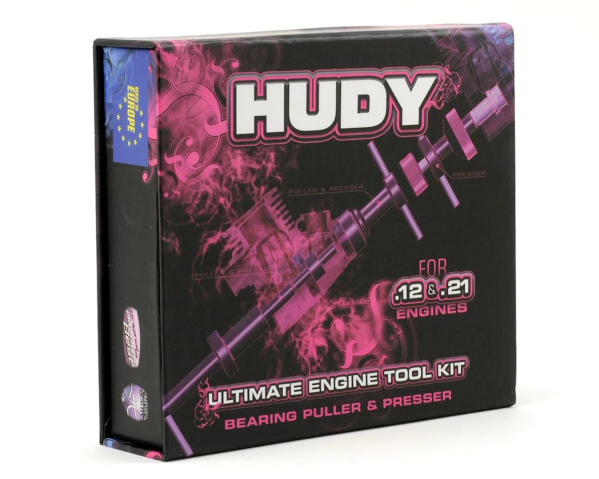 This is the Hudy Ultimate Engine Tool Kit, and is intended for use with .21 size nitro engines. The HUDY Ultimate Engine Tool Kit was developed for serious nitro racers that want to perform critical maintenance on their nitro engines. The set consists of one tool for pulling out the rear engine bearing, and another tool that will press out the front engine bearing and also install both front & rear engine bearings. These tools allow you to easily and effectively remove and install both front and rear engine bearings. The universal components have been designed to work with either .12 or.21 engines with the use of optional bushings and collets that are available for use with different-sized engines.