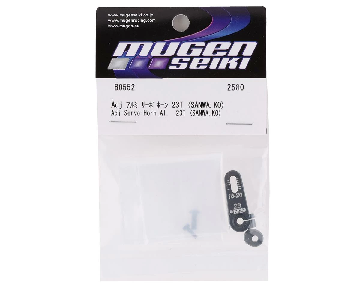 Mugen Seikiย Aluminum Clamping Servo Horn. This optional servo horn is designed to to fit JR, Airtronics, KO Propo servos or any other servo with a 23T spline. Package includes one aluminum servo horn, one mount screw and one clamping screw.