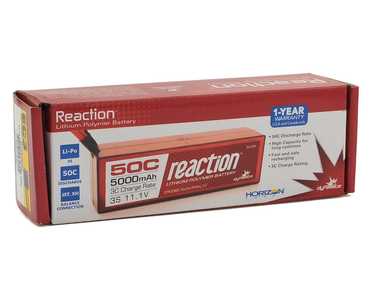 The Dynamite 50C Reaction LiPo Battery packs represent awesome quality and value that provide the power and performance for the everyday RC enthusiast. Whether a serious backyard basher or an entry-level basher, these 50C packs provide the power needed to get the most out of any RC vehicle; cars, truck or boats. These 50C packs were specially designed to provide durable power when it is needed most. Ranging from 2S, 3S to 4S packs all with a 50C discharge rate at capacities up to 5000mAh, we have just about any 1/10- or 1/8-scale surface application covered.