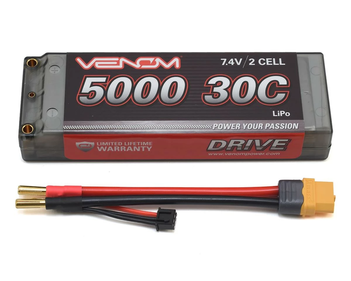 The Venom 30C 2S 5000mAh 7.4V LiPo Hard Case battery pack delivers performance and power. Developed to power a wide variety of remote-controlled products from your short course truck, buggy, monster truck, heli, jet, airplane or quad this battery has all of the heavy-duty features you expect.