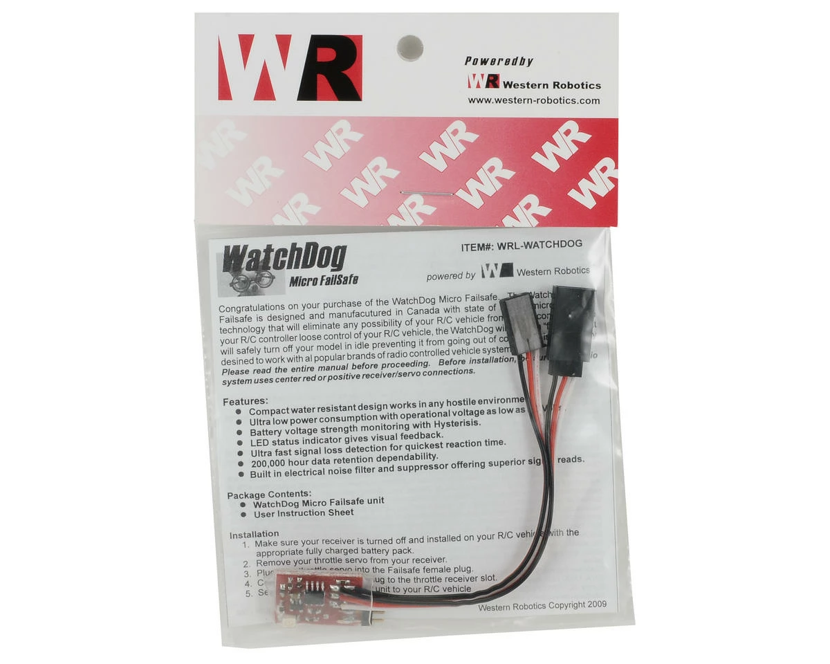 This is the Western Robotics WatchDog Micro Fail-Safe. The WatchDog Micro Failsafe is designed and manufactured in Canada with state of the art micro controller technology that will eliminate any possibility of your R/C vehicle from losing control. Once your R/C controller loses control of your R/C vehicle, the WatchDog will act as a “failsafe” that will safely turn off and put you R/C vehicle in idle preventing it from going out of control. It is universally designed to work with all popular brands of R/C systems. It is also equipped with male and female plugs to provide easy installation. This device is recommended for all types of R/C car and truck models.
