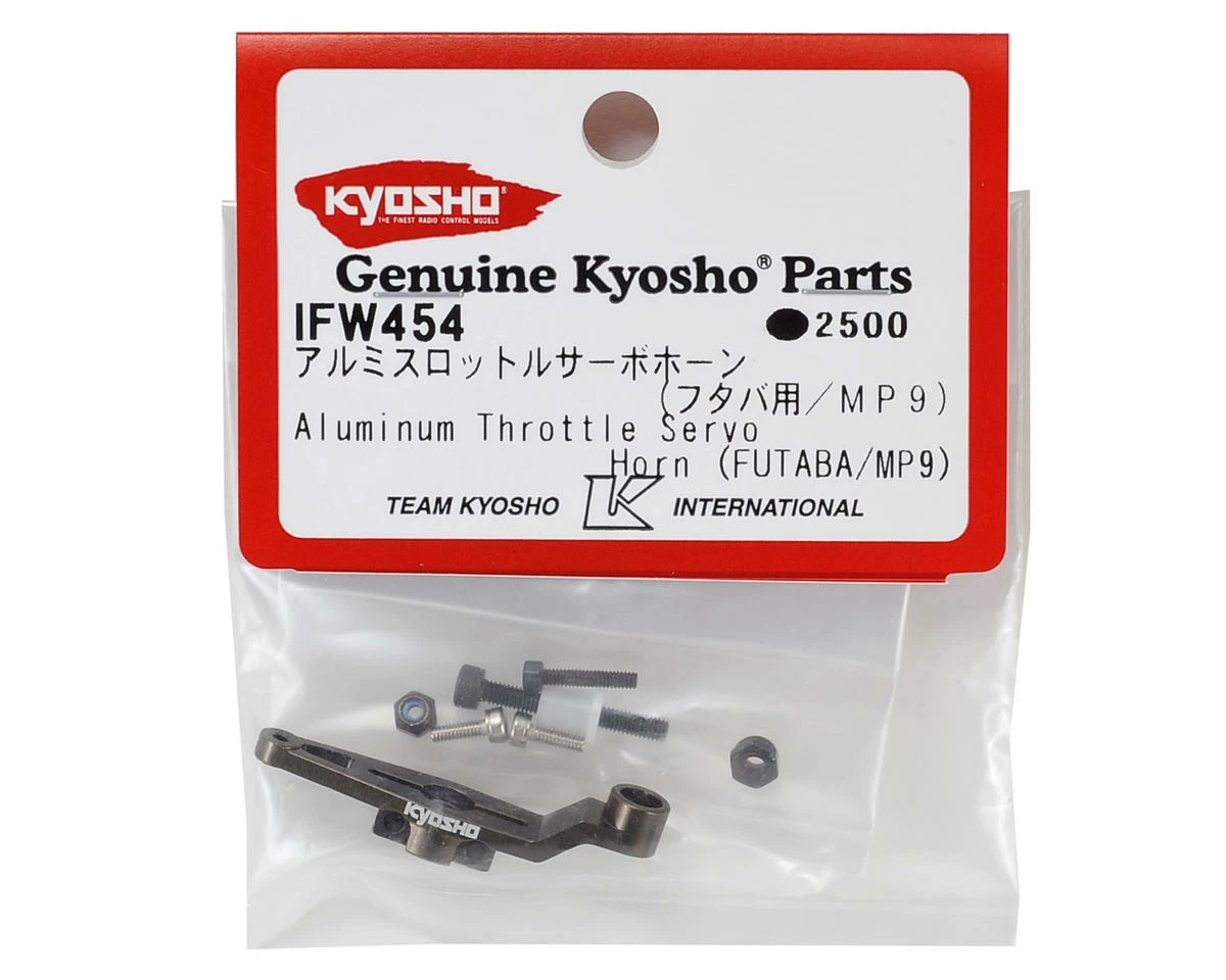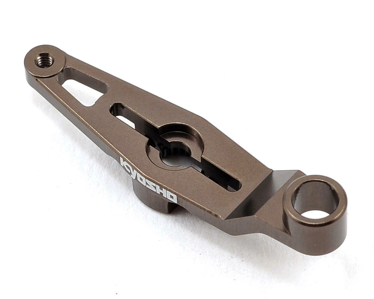 This is an optional Kyosho MP9 25 Tooth Aluminum Throttle Servo Horn. This aluminum servo horn is compatible with all MP9 series vehicles and is a great upgrade for your throttle/brake linkage assembly. The horn is stepped on the brake side, eliminating the collars that are used to raise the linkage rods. Additionally, the horn features a clamping design for added security, a unique anodized finish and a laser etched Kyosho logo.