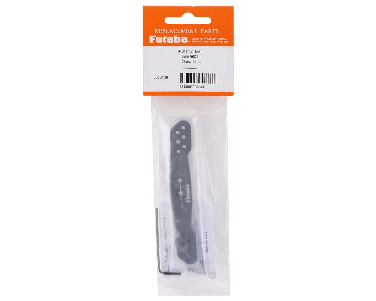 Futaba 89mm Aluminum Clamping Servo Horn. This optional servo horn is intended for servos equipped with a 25T servo spline. Package includes one servo horn, one clamp screw and one allen key.