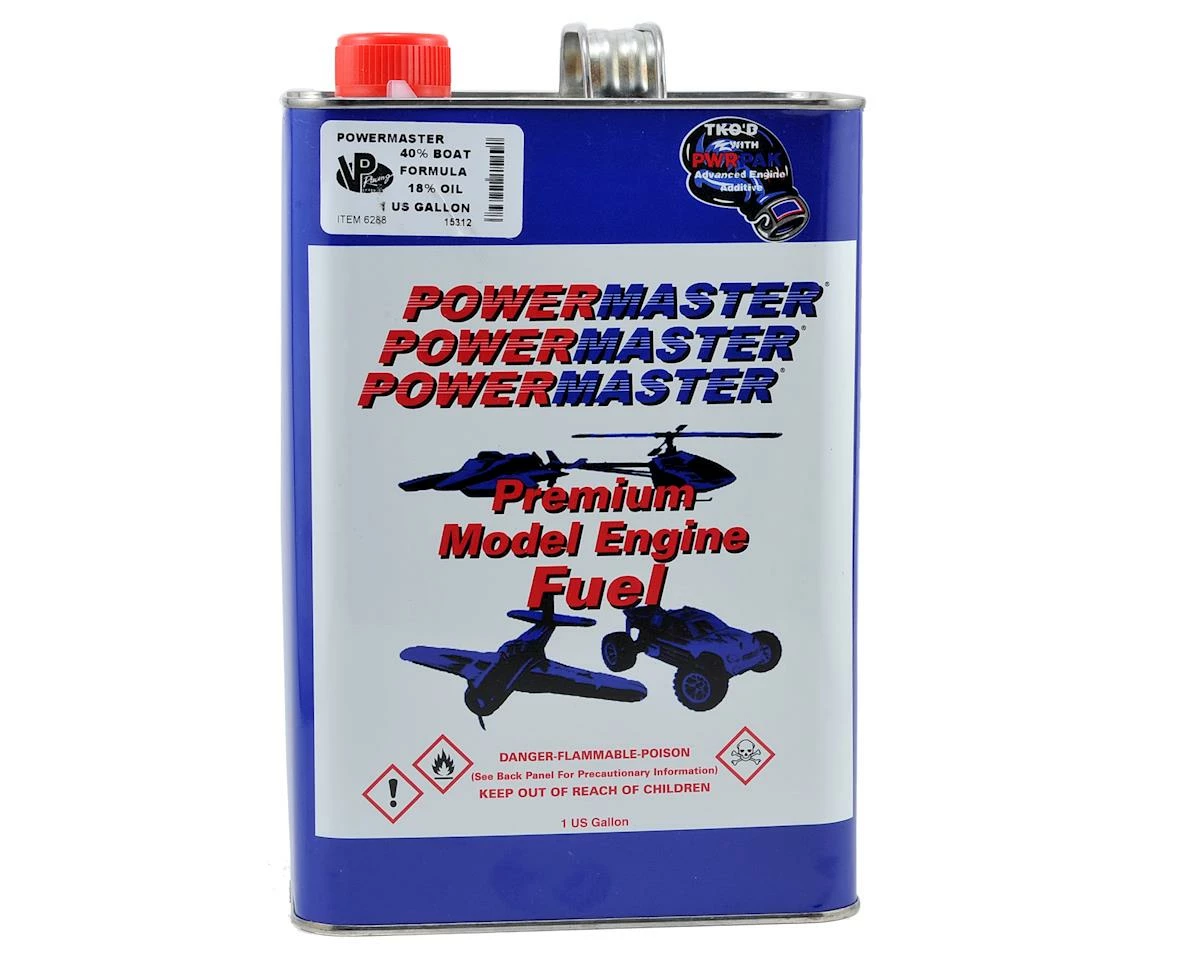 This is a six gallon case of PowerMaster Boat Formula 40% Boat Fuel. PowerMaster Boat Formula was developed by VP Racing Fuels to be THE answer for your boat racing needs. Boat Formula fuel is formulated with a high-performance castor/synthetic oil package for incredible rpm and power gains without sacrificing reliability. The same quality and performance standards are found in every boat blend.