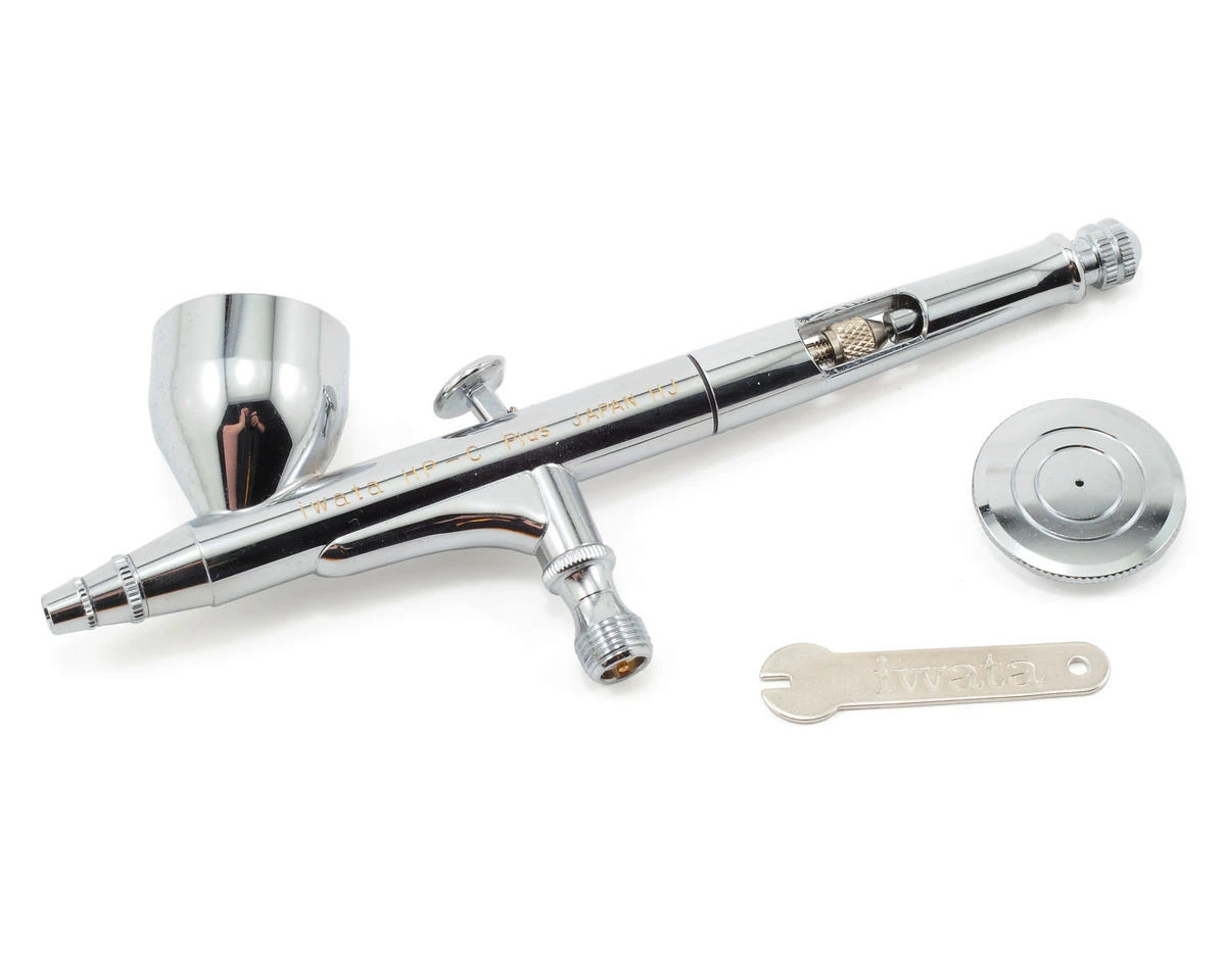 This is the Iwata HP-C Plus Airbrush. Renowned as the professional’s workhorse, this popular High Performance Series brush is a practical choice for most airbrush uses. The HP-C Plus has been pumped up with inspired new features that include a dual-purpose, cutaway and pre-set handle for easy clean up and precise control of paint flow. Also featuring PTFE needle packing for automotive or other solvent-based paints, while a larger (0.3mm) needle/nozzle configuration allows use with most media. Larger threads on the nozzle offer a more secure fit and better centering of the nozzle and a single-piece auxiliary lever/needle-chucking guide provides easy assembly. Its larger redesigned 1/3 oz. (9ml) tapered gravity-feed cup ensures easy clean up and more efficient paint flow, and is also useful for mixing custom colors and quick color changes. The short paint passageway from the cup to the front of the airbrush gives it a responsive feel and allows it to be one of the quickest airbrushes in the industry. With all these features combined, this truly is a airbrush that does it all.