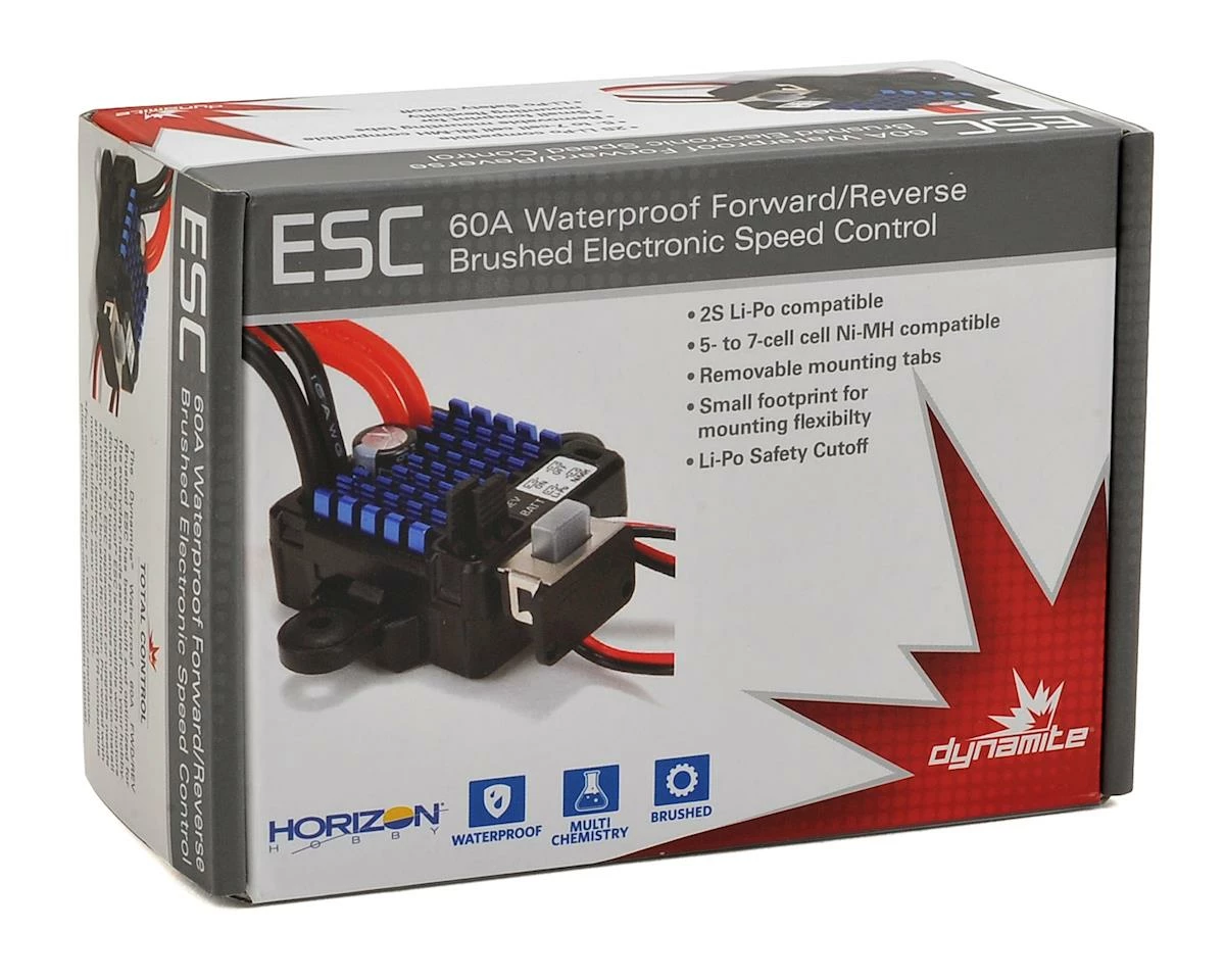 Dynamite’s 60A Marine Waterproof Brushed ESC has been built and optimized for everyday boating needs. The ESC is compatible with motors down to 12 turns and provides an easy to install solution for ESC replacement or upgrade. Pre-wired with an EC3 battery connector and RTR compatible motor bullets for easy installation.