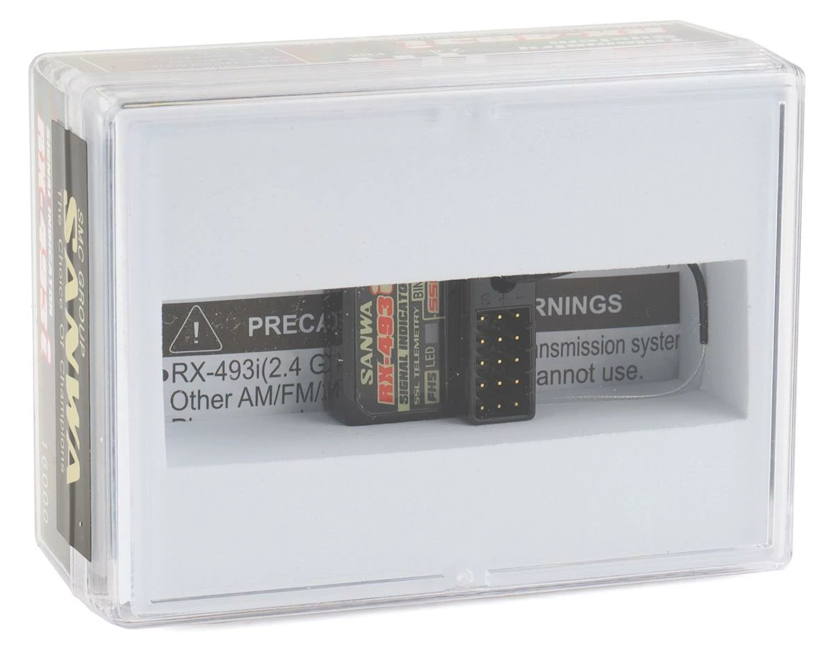 The Sanwa/Airtronics RX-493i 2.4GHz FHSS-5 4-Channel Telemetry Receiver is a FH5 and SUR response mode compatible receiver that features a short coaxial antenna with an integrated antenna tube mount, ensuring stable performance in about any situation compared to built-in antenna receiver units. Furthermore the high-voltage compatible receiver is waterproof. The receiver measures 26ร23.2x14mm, it weighs in at 6.2g and is designed to work with the Sanwa M17 or MT-5 radio system.