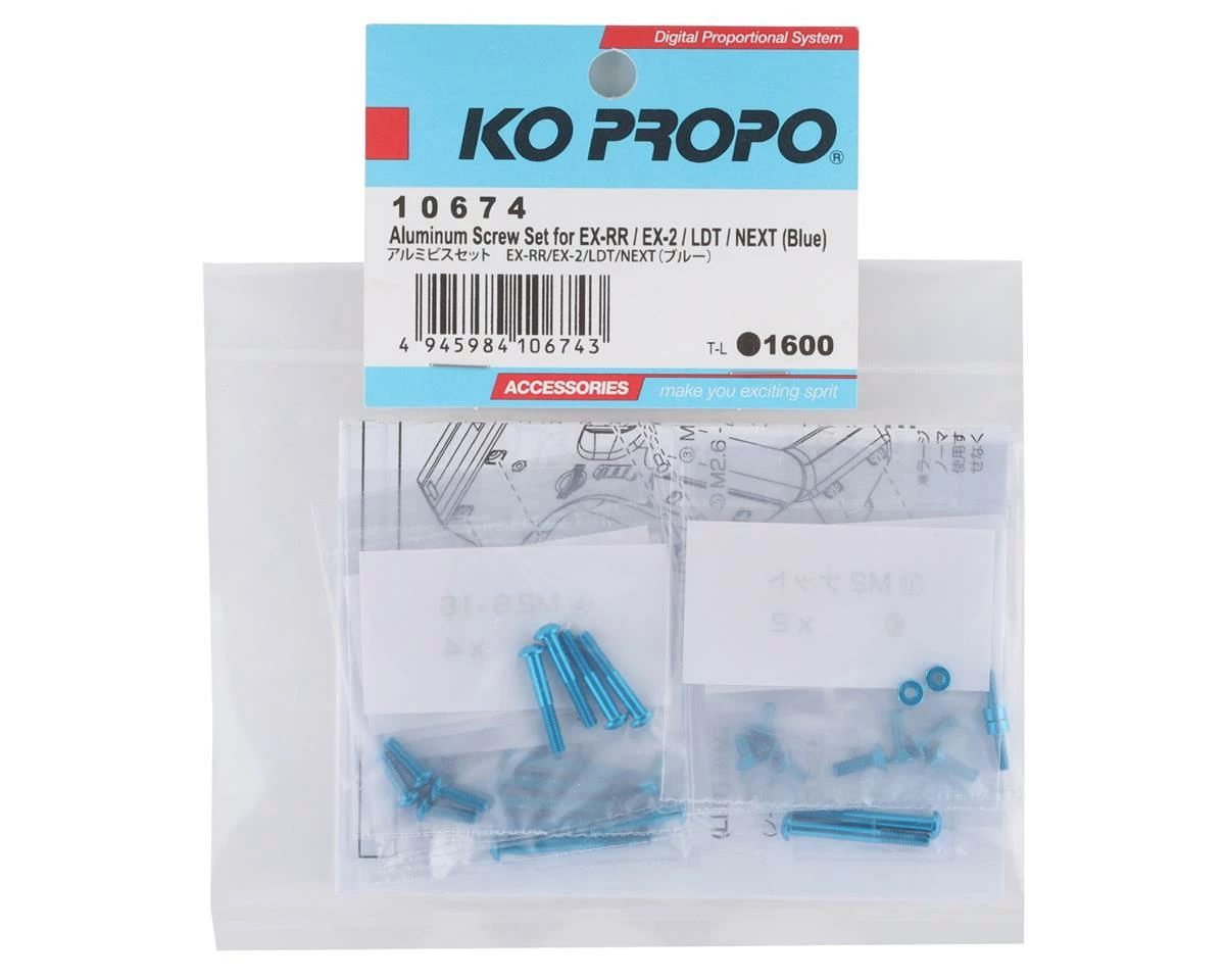 KO Propo EX-NEXT Aluminum Screw Set. Add some custom bling to your KO Propo transmitter with this optional screw kit. These aluminum screws are anodized deep blue and look amazing. While this kit is intended for the EX-Next it will work for the KO Propo EX-RR and EX-2 model transmitters. Package includes one complete screw kit with instructions.