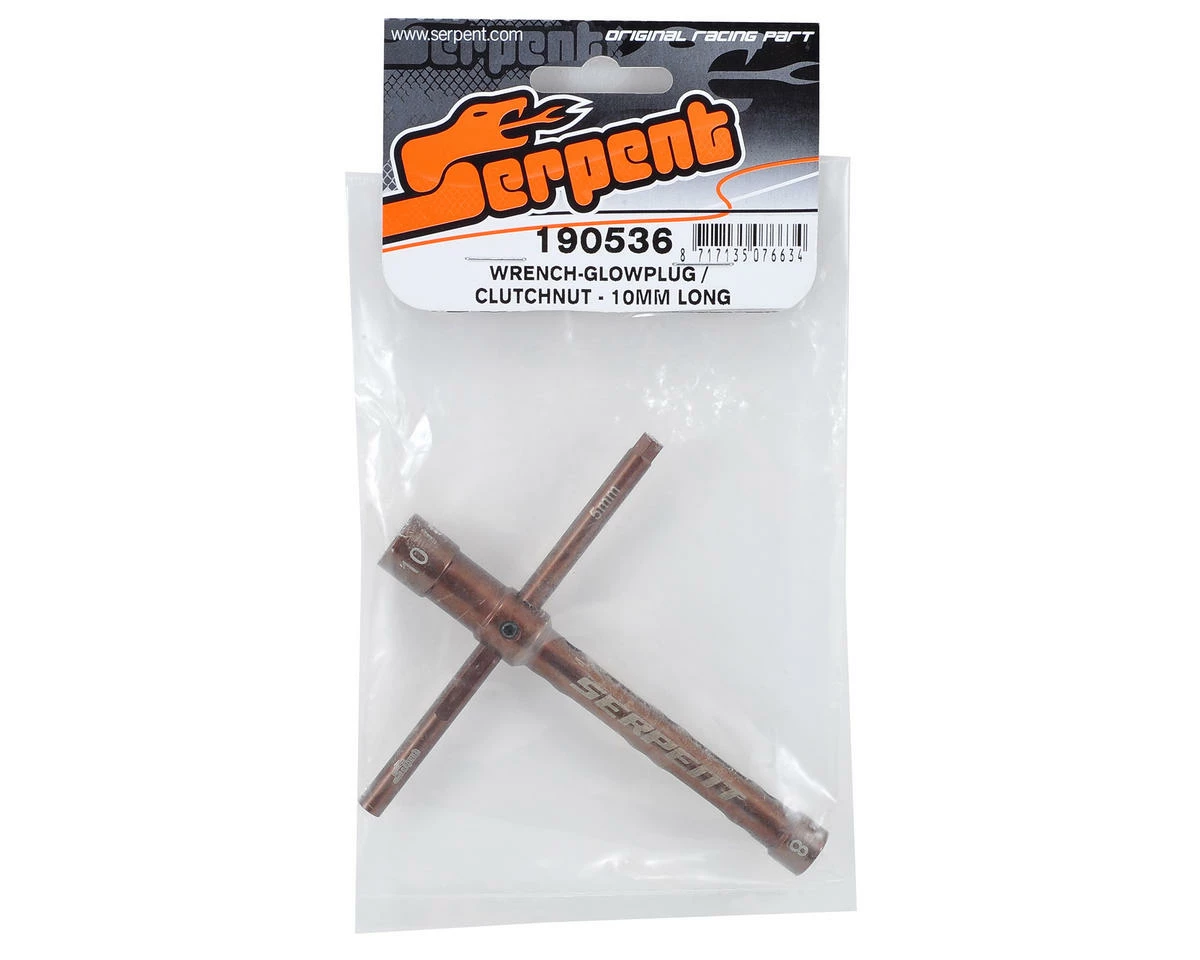 This is a Serpent Glow Plug/Clutch Nut Wrench. This wrench features a 3-in-1 design with an 8mm wrench on one end that can be used for glow plug installation and removal, and a 10mm wrench on the opposite end that is perfect for installing and removing clutch nuts. The T-Bar has a 5mm hex tip on the side, making this tool useful for a variety of applications.